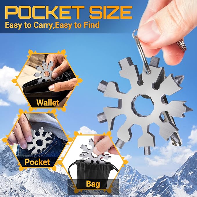 Compact snowflake-shaped multi tool with 20 functions including screwdriver, wrench, and bottle opener. A perfect stocking stuffer gift for men, dads, and teens.