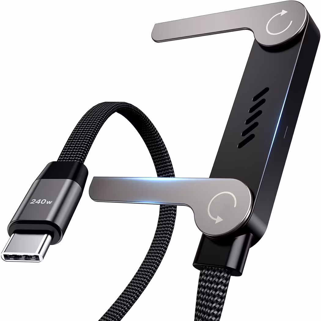 This 240W USB-C to USB-C cable is the ultimate multitasking accessory for your tech setup. With a massive 240W power delivery capacity, it can safely fast-charge a MacBook Pro, iPad, or the latest Samsung Galaxy at top speeds. The standout feature is the patented 90-degree T-shaped connector; when plugged in, it acts as a kickstand, propping your phone up at the perfect viewing angle for movies or video calls. Measuring 5 feet in length, it offers the perfect balance between reach and portability. The heavy-duty braided design ensures it survives thousands of tugs and twists, while the built-in E-marker chip regulates current for safe, efficient power delivery.